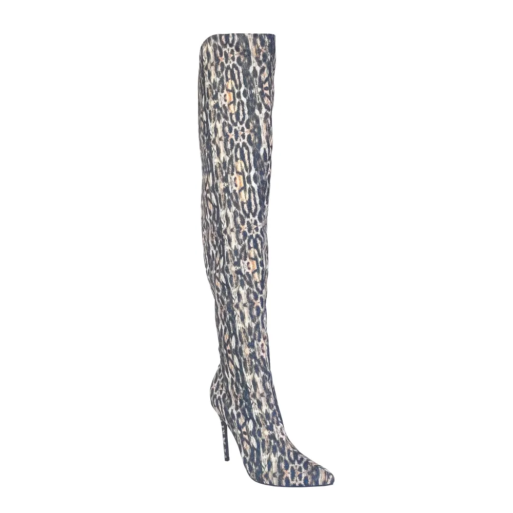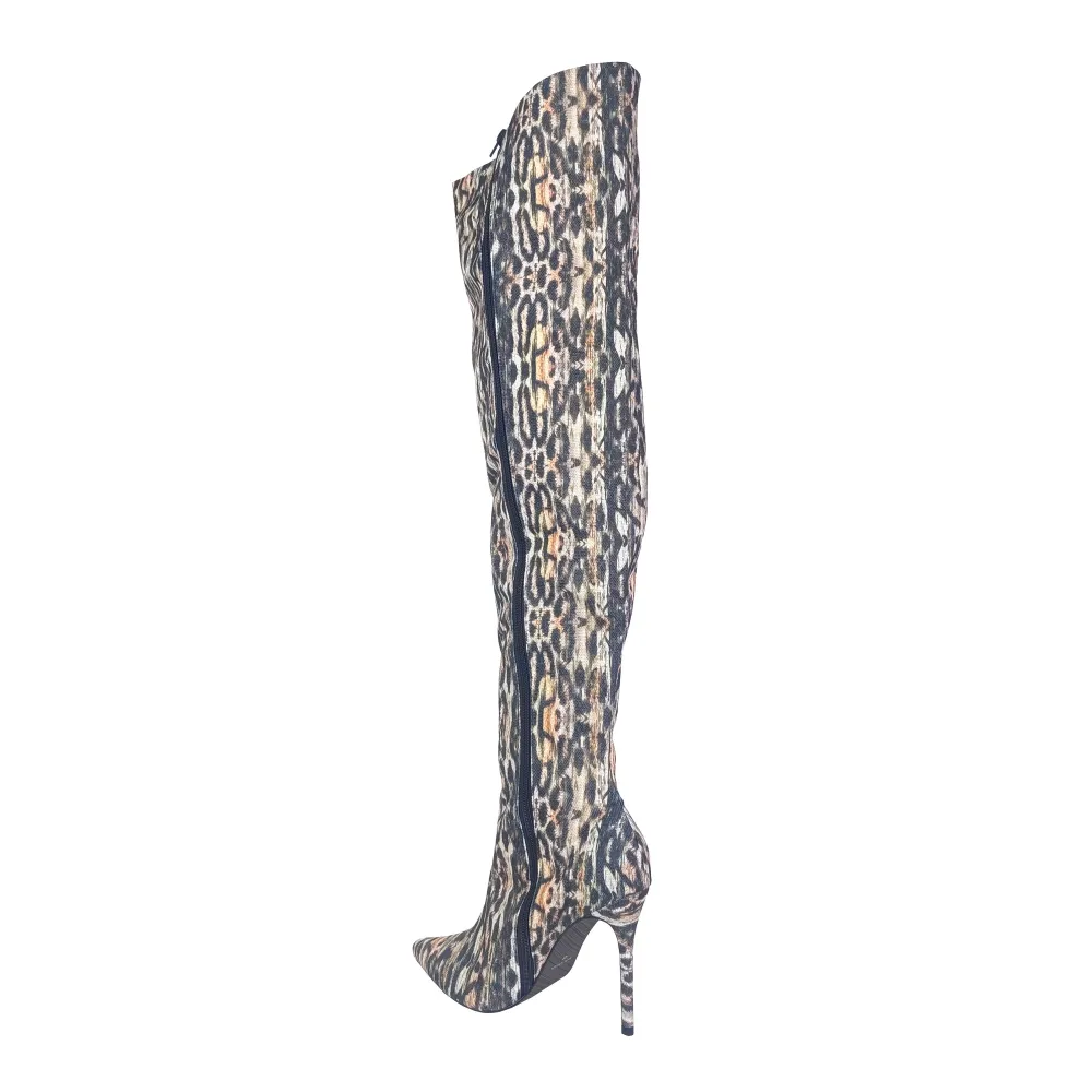 Bota feminina animal print bege de cano extra longo (cano alto até a coxa) com bico fino e salto alto agulha