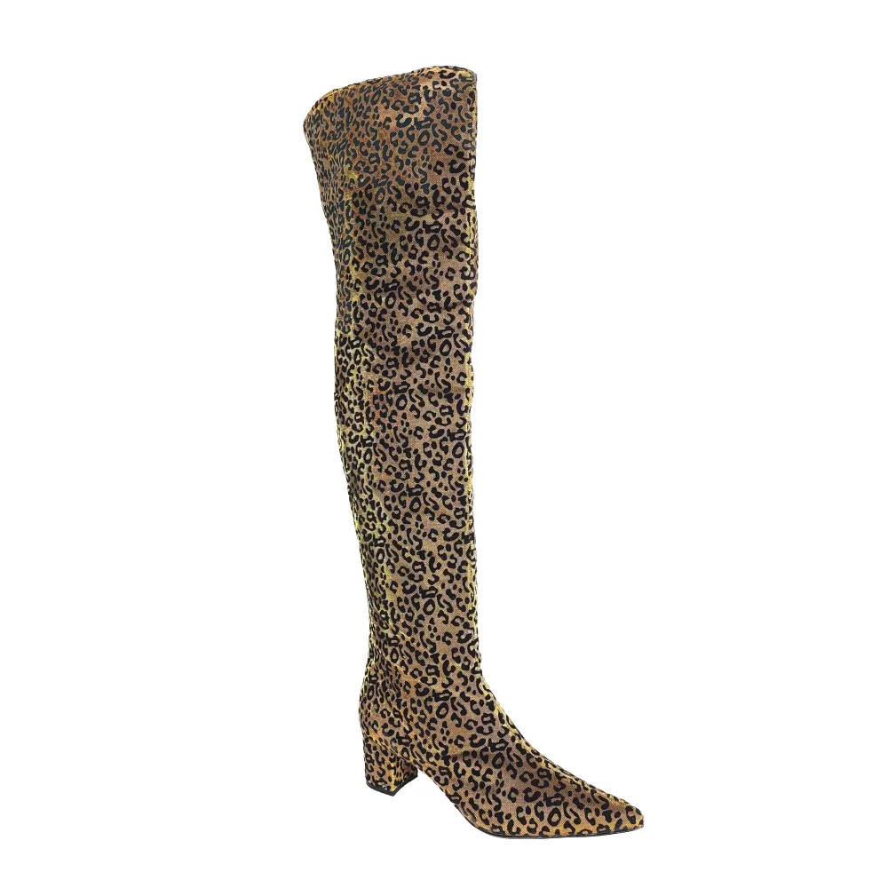 Bota feminina de tecido animal print e cano extralongo (até a coxa) com bico fino e salto baixo grosso
