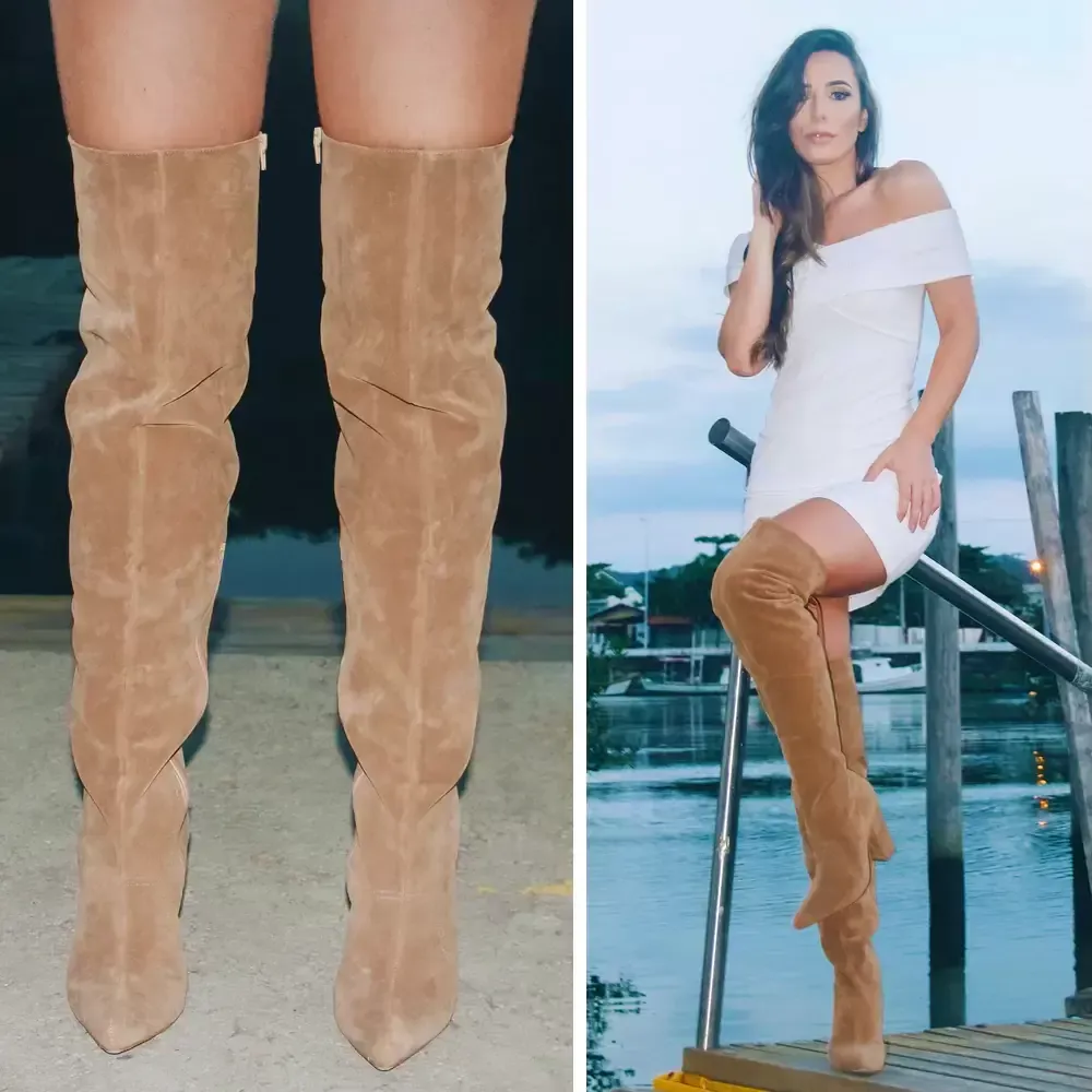 Bota feminina suede de cano extra longo (cano alto até a coxa) com bico fino e salto alto grosso, em tamanhos pequenos e grandes: 42, 43 e 44