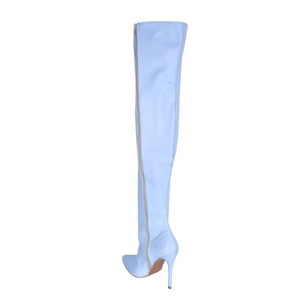 Bota feminina de cano extra longo (cano alto até a coxa) e azul claro, com bico fino e salto alto agulha