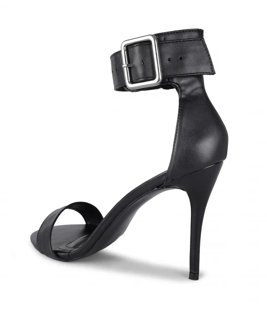 Sandália feminina social de couro artificial com bico redondo, salto alto fino (agulha), tiras com fivela (atacador) e fecho no tornozelo, em tamanhos grandes: 40, 41, 42, 43, 44 e 45